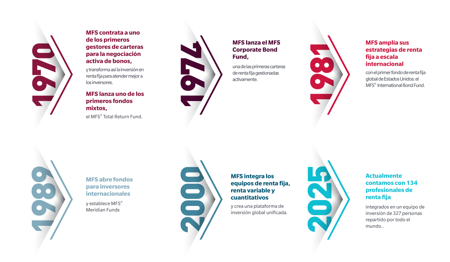 MFS fue pionera de la gestión activa en 1924 y, a partir de 1970, se convirtió en una de las primeras sociedades de inversión en negociar de forma activa los bonos como cualquier otro valor, lo que aportó una vía alternativa para la creación de valor a largo plazo para los inversores en renta fija.