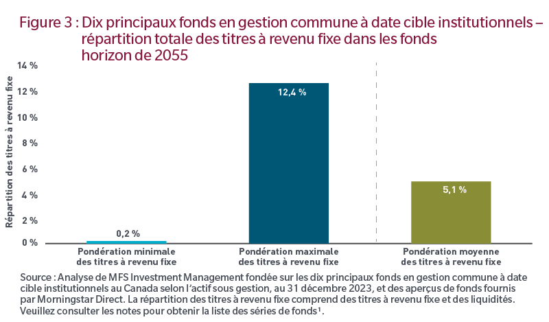 La fourchette entre les pondérations minimale et maximale des titres à revenu fixe est beaucoup plus large dans les fonds à horizon de retraite rapproché, lorsqu’un participant approche de la retraite, ce qui indique que les gestionnaires de fonds à date cible sont moins d’accord sur le montant à attribuer aux titres à revenu fixe. Bien qu’une analyse de la répartition des fonds à horizon de 2055 montre une fourchette de 12,2 % entre les pondérations minimale et maximale des titres à revenu fixe, les fonds à horizon de 2025 affichent une fourchette de 35,7 %. Les données illustrent les opinions divergentes des gestionnaires de fonds à date cible lorsqu’il s’agit de déterminer un niveau approprié de titres à revenu fixe.
