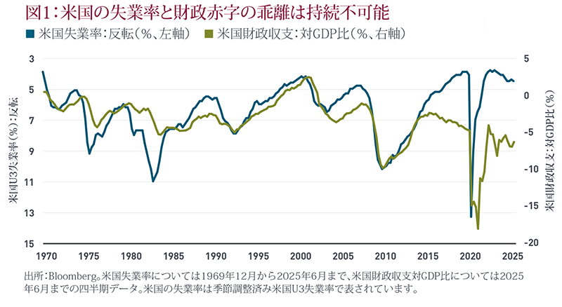 図表1に示すように、米国が完全雇用状態で失業率が4%を下回っているにもかかわらず、財政赤字は国内総生産(GDP)の約6%で推移しています。この乖離は持続不可能とみられます。さらに、最新の財政政策である減税・歳出法「One Big Beautiful Bill Act(OBBBA)」の成立により、今後数年間で財政赤字がさらに拡大する見込みです。この財政状況は、米ドルにとって持続的な圧力となる可能性が高いと考えます。
