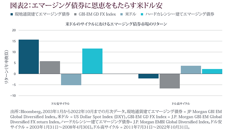 これらの要因により米ドル安が続くことが示唆されています。図表2に示されているように、このような環境は、ハードカレンシー建てと現地通貨建てエマージング債券の両方を支えるものと考えます。米ドル安はエマージング市場に有益な波及効果をもたらします。多くの国における外貨準備高の増加につながり、これがグローバルな変動に対する緩衝材となり、現地通貨の安定化に寄与するとみられます。また、ハードカレンシー建て債券の返済コストも低減され、財政圧力が緩和されます。さらに、米ドル安は一般的にコモディティ価格を押し上げる傾向があり、特にコモディティ輸出に依存するエマージング諸国にとって追い風となると考えます。これらの効果を総合すると、エマージング市場にとってすでに支援的なグローバルな環境がさらに強化されることになるとみられます。