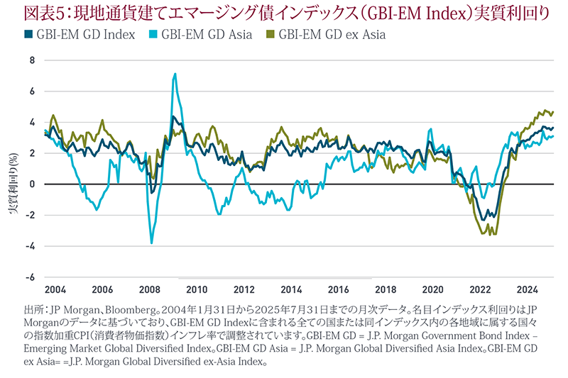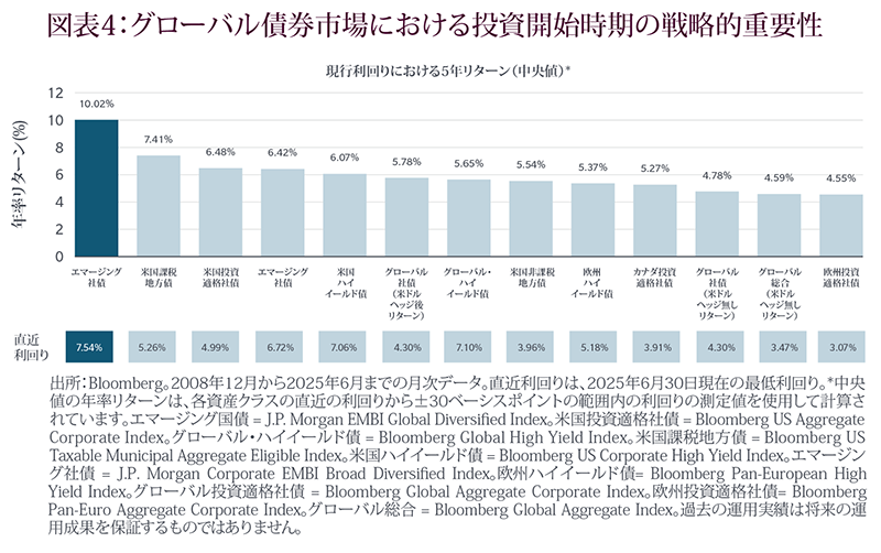 同時に、ハードカレンシー建てと現地通貨建ての両方のエマージング債券の利回りは依然として高水準にあり、投資家にとって魅力的な投資開始の機会を提供しています。例えば、ハードカレンシー建てエマージング債券の利回りは現在、過去の中央値を上回る水準で推移しています。過去のデータによると、同様の利回り水準から投資を開始した場合、この資産クラスは5年間で年率約10%のリターン(中央値)を達成しています。現在の市場環境では、投資家は高い利回りだけでなく、エマージング諸国全体におけるマクロ経済ファンダメンタルズの改善による分散効果や追い風の恩恵を受けることが期待されます。
