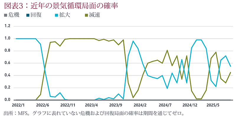 米連邦準備制度理事会(FRB)による金融政策の引き締め開始以降、住宅指標や製造業指標の弱さ、失業率の緩やかな上昇、そして堅調な民間消費などを反映し、不確実性が極めて高い状況が続いています。その結果、モデルは拡大局面と減速局面の両方に常に一定の確率を割り当てるという、異例の結果となりました。