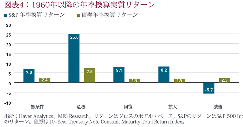 これまで、米国株式は拡大局面では平均をやや上回るリターンを創出してきた一方、減速局面では平均を大幅に下回るリターンとなってきました。全体では、リターンがマイナスとなるのは減速局面のみです。危機局面のリターンが最も高いというのは直感的には理解しにくいかもしれませんが、我々の景気循環モデルは純粋にマクロ経済データに基づいているのに対し、金融市場は一般的に予想を基に動く傾向があります。そのため、マイナスリターンは危機ではなく減速局面で観測されます。