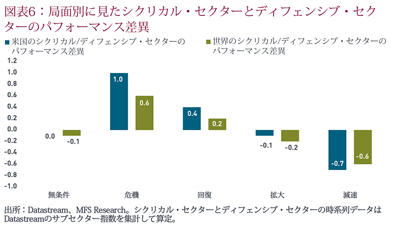 この指標は、シクリカル・セクターとディフェンシブ・セクター間の配分決定にも活用できます。本モデルのデータによれば、シクリカル・セクターは危機および回復局面のみにおいて魅力的な投資対象となることが示唆されています。一方、拡大局面ではディフェンシブと概ね同水準のリターンとなり、減速局面では劣後する傾向があります。