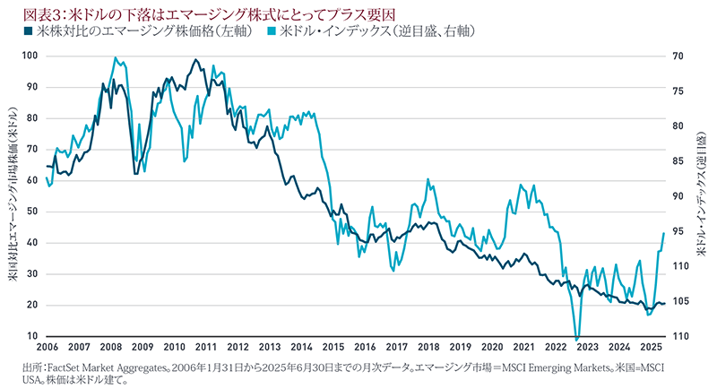 - 米ドルの弱含み:エマージング株式は歴史的に米ドル安と強い相関があります。米ドル安は、貿易競争力の向上、資本流入の促進、コモディティ需要の追い風となります。