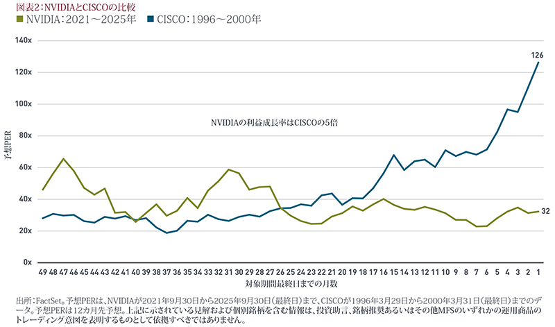 一部で高い不確実性はあるものの、現在のバリュエーションは警戒するほどの水準ではありません。現在は1999年の状況とは異なり、大手テクノロジー企業のPERはドットコム・バブル期につけたピークを大きく下回っています。例えば、2000年にCISCOの予想PERが126倍に達していたのに対し、現在のNVIDIAの予想PERは約28倍です。バリュエーションは確かに上昇していますが、特に堅調な業績見通しを踏まえると、差し迫った調整リスクを示唆する水準には達していません。バリュエーションが高いことはさておき、現在のメガキャップ・テクノロジー銘柄のファンダメンタルズは25年前に比べてかなり強くなっており、強固なバランスシート、プラスのキャッシュフロー、高い収益性を有しています。さらに、最近はAI関連の設備投資が急増していますが、経済全体の懸念材料となる水準には達していません。