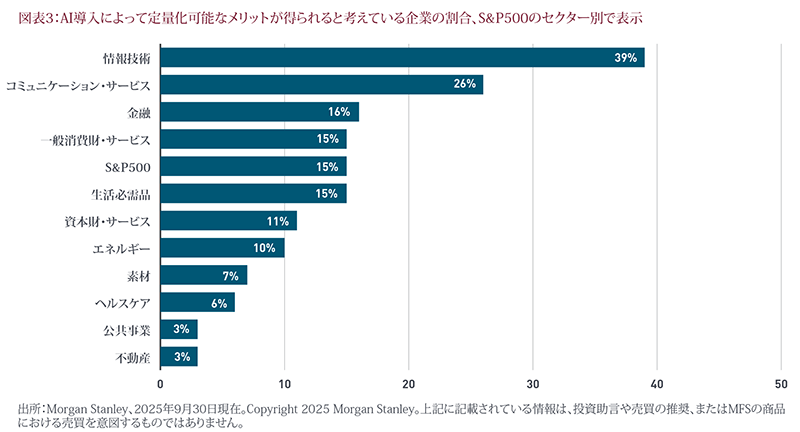 我々は、AI関連銘柄のバリュエーションは概ね適正な水準にあるとみています。大手テクノロジー企業のバリュエーションは上昇していますが、現在の株価収益率(PER)はドットコム・バブル期のピークを下回っており、強力なファンダメンタルズの裏付けもあります。AIはさまざまなセクターに変革をもたらしますが、導入予測が過度に楽観的になるリスクやAIエコシステムにおける複雑な資金調達の仕組みに起因するリスクもあるため、引き続き注意深く見ていく必要があります。これとは別に、企業によるAIの導入についても検証したいと思います。AIによって企業価値を創造する方法は変化しますが、企業はガバナンスとセキュリティを確保する必要があるため、導入を慎重に進めています。データの問題や文化的な課題が克服されれば、医療や物流といったさまざまな業界で導入が加速し、生産性とイノベーションの向上を期待できます。投資家は、強力なAI研究開発力と戦略的パートナーシップを持つ企業を投資対象として検討することが必要です。
