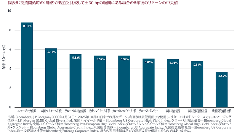 グローバル市場には魅力的な投資機会が多数存在します。世界経済のファンダメンタルズが底堅いことから、グローバル・クレジットは今後も良好なパフォーマンスを発揮する好位置にあると考えています。こうした中、エマージング債券市場は、マクロ経済の堅調なファンダメンタルズ、魅力的な利回り、米ドルの下落圧力から引き続き恩恵を受けるとみられます。ただし、銘柄を選別することが重要です(図表5)。また、リスク許容度が高い投資家にとっては、株式に代わる低ボラティリティの投資先として、グローバル・ハイイールド債と現地通貨建てエマージング債券が相対的に魅力的な資産となりそうです。