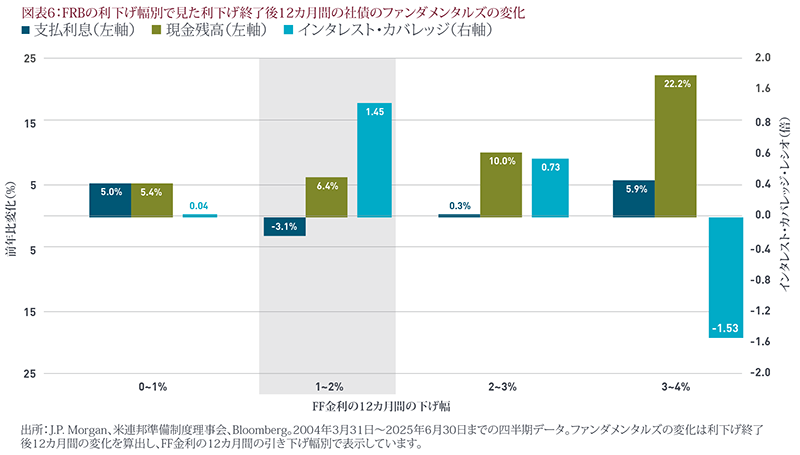 社債にとって最適な利下げ幅。これらのファンダメンタルズ指標が利下げサイクルを通じてどのように変化するかを理解するために、過去の利下げ終了後12カ月間のファンダメンタルズ指標の変化とフェデラル・ファンド(FF)金利の12カ月間の引き下げ幅の平均を算出しました(図表6)。歴史的に見ると、社債のファンダメンタルズが最も改善するのは、政策金利が1%~2%低下したときです。下げ幅がそれ以下の場合は、企業の借り換えの勢いにそれほど弾みがつかず、それ以上の場合はFRBによる非常事態的な利下げやリセッション(景気後退)リスクの高まりを示す兆候である可能性が高いことになります。最近の利下げ状況を踏まえると、今回は1%~2%低下する環境に相当すると考えられます。つまり、現在の利下げは非常事態的なものではなく、サイクル半ばの調整であり、金融政策の正常化に向けた動きのようです。