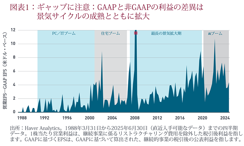 多くの場合、調整後利益は標準化された手法で算出した利益よりも高く算出される傾向があります。下記のグラフが示すように、入手可能な米国のデータを用いると、非GAAPによる利益とGAAPによる利益の差は、上下しつつも、一般的に景気サイクルの成熟とともに拡大します。