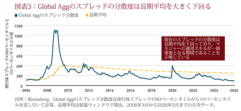債券のベータリターンが低下する中で、リターンの創出におけるアルファの役割が増す可能性があります。直近数カ月において、アクティブ・マネジャーのアルファはGlobal Aggの長期平均である91ベーシスポイントを上回る水準となっています(図表2)。複雑且つマクロのボラティリティが高い現在の市場環境、そして分散投資とリスク管理へ注力することにより、アクティブ・マネジャーがより高い超過リターンを獲得できる機会が生まれています。そうした中で、このアルファがトータルリターンに占める比率はこれまでより高くなる可能性があります。ファンダメンタルズのミスプライシング、銘柄間の格差の拡大、勝者と敗者の顕在化といった要因が相まって、アクティブ・マネジャーに有利な市場環境が広がっています。Global Aggのスプレッドは、ここ数年で分散度が最も小さい状態にあります。これはとりわけ銘柄選択に関して、アクティブ・マネジャーの質に対するプレミアムが一段と高まっていることを意味します(図表3)。