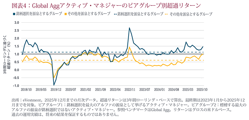 グローバル市場の変調を踏まえると、今後はファンダメンタルズの差異が市場の主な原動力となる可能性が高いと考えられます。とりわけ、AIに主導されたテクノロジーのディスラプション(創造的破壊)を受け、今後は勝者と敗者に二分化していきます。このような状況を踏まえ、将来を見据えると、銘柄選択は超過リターンの主たる要因となると考えており、ひいては債券のトータルリターンにも寄与する可能性が高いと考えます。また、グローバルなマルチセクター戦略においてはスタイル分散効果をもたらす可能性があると考えます。というのも、銘柄選択を主たるアルファ源泉と標榜するアクティブ・マネジャーは少数派だからです。さらに重要な点として、銘柄選択は、とりわけ他のアルファ源泉と比べて、高い超過リターンの創出に資する可能性があります。