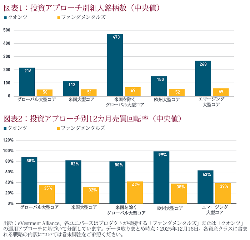 次頁の図表1と2が示すように、こうしたファンダメンタルズ運用とクオンツ運用の特性は、さまざまな株式ユニバースにおいて共通して観察されます。大型コア株式における平均的なファンダメンタルズ運用では、保有銘柄数は一貫して少なく、売買回転率もクオンツ運用に比べて低い傾向があります。例えば、グローバル株式ユニバースにおけるファンダメンタルズ運用では、組入銘柄数の中央値は50銘柄、年間売買回転率の中央値は35%となっています。一方、グローバル株式のクオンツ運用では、保有銘柄数の中央値は200銘柄超、売買回転率は88%であり、さらに、同運用戦略の約40%において、売買回転率が100%を超えています。