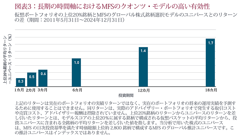 図表3は、このクオンツ・モデルにおける時間軸別リターンを示したものです。多くのクオンツ・モデルが短期の売買シグナルに重点を置いているのとは対照的に、MFSのクオンツ・モデルは長期の時間軸においても高い有効性を示していることが確認されます。