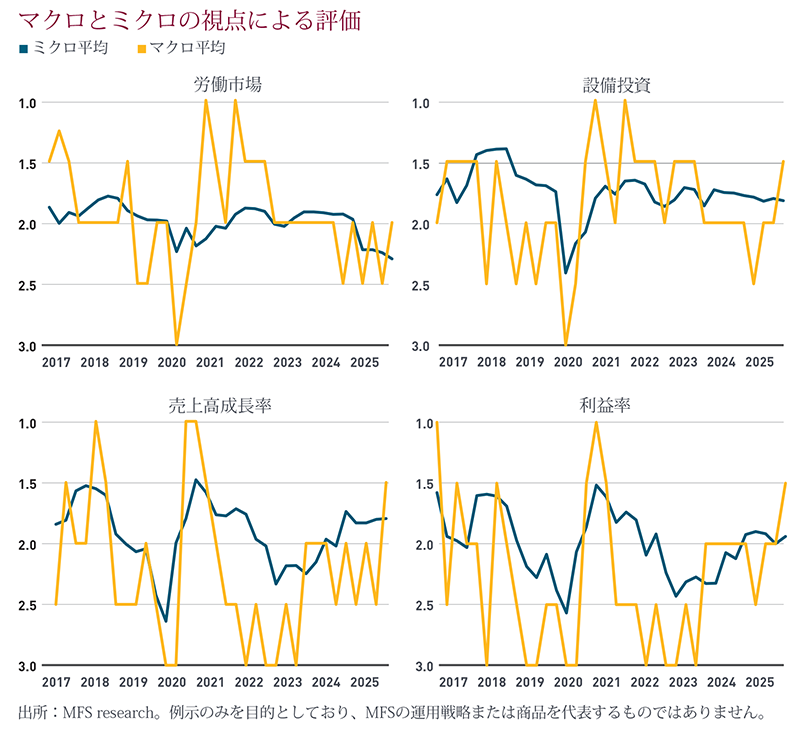 MFSのマクロ・ミクロ・フォーラムは、経済の転換点を予測するためにはトップダウンの分析と併せてボトムアップのシグナルの収集が有効であるとの考えの下、再現性と体系性のあるアプローチの構築を目指して、リスクバジェッティング・プロセスの一環として設立されました。ミクロ側とマクロ側の議論は多くの場合、大筋では一致し、違いはわずかにとどまります。その場合、結果としてより高い確信につながります。